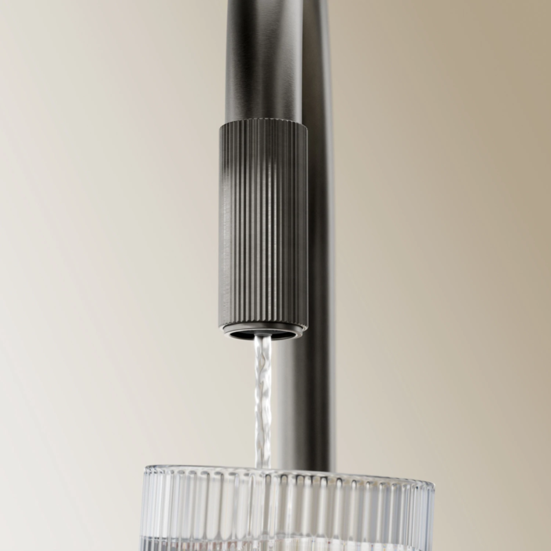 Aiškiai apibrėžtos ir tiksliai išbaigtos detalės leidžia intuityviai naudoti, nukreipiant į dvi atskiras vandens sroves: įprastą vandenį šalia svirties ir filtruotą vandenį snapelio gale – tiesiog pasukite briaunuotą snapelio žiedą, kad greitai pripiltumėte stiklinę skanaus šviežio geriamojo vandens.