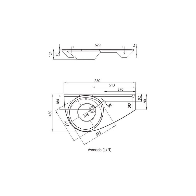Praustuvas Avocado R – elegantiškas ir praktiškas lieto marmuro (kompozito) pakabinamas praustuvas, sukurtas specialiai montavimui virš vonios arba ant sienos, siekiant sutaupyti vietos vonios kambaryje. Turi 35 mm maišytuvo angą, integruotą perpildymo sistemą ir dešinės pusės variantą (R).