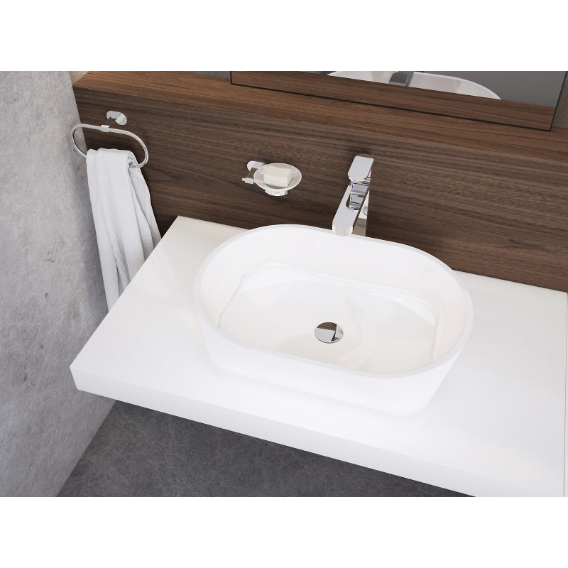 Solo 58 – elegantiškas lieto marmuro praustuvas, skirtas montuoti ant stalviršio ar spintelės. Jo ovalios formos ir baltas paviršius suteikia vonios kambariui šiuolaikišką ir minimalistinį įvaizdį.
